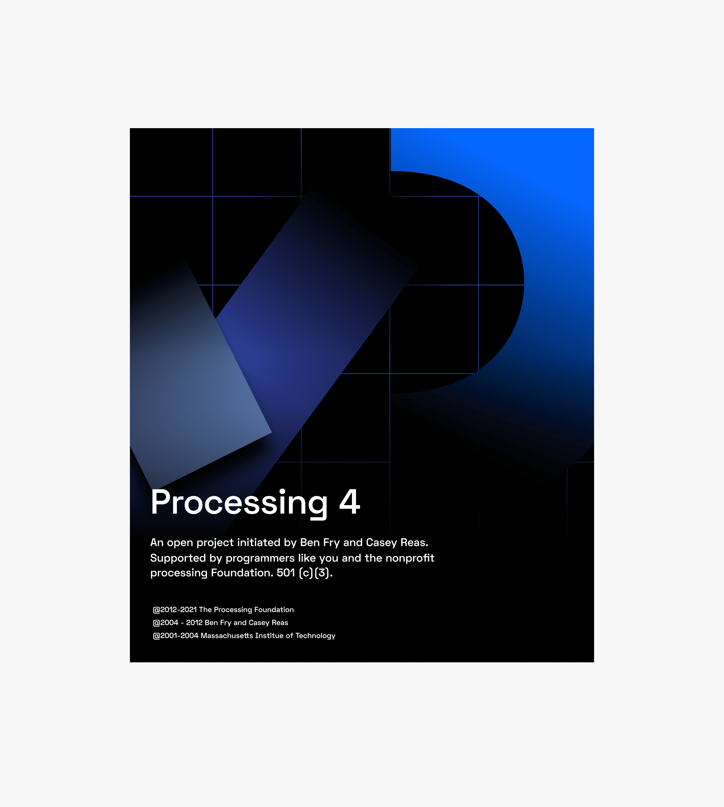 The Processing logo balances legacy and a forward-thinking vision by reviving its former P logo with subtle tension and playfulness brought on by projecting it onto the grid.
